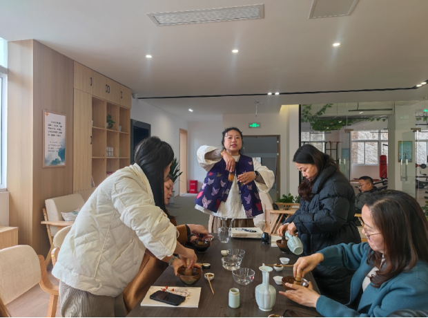 现场职工在轻松愉悦的氛围中,专心听讲,认真实践,跟着老师的步骤认真学习,在沉浸式体验中了解宋人的饮茶方式,熟悉仿宋点茶的技法,实践宋代的生活美学,打开了点茶文化的精彩世界。