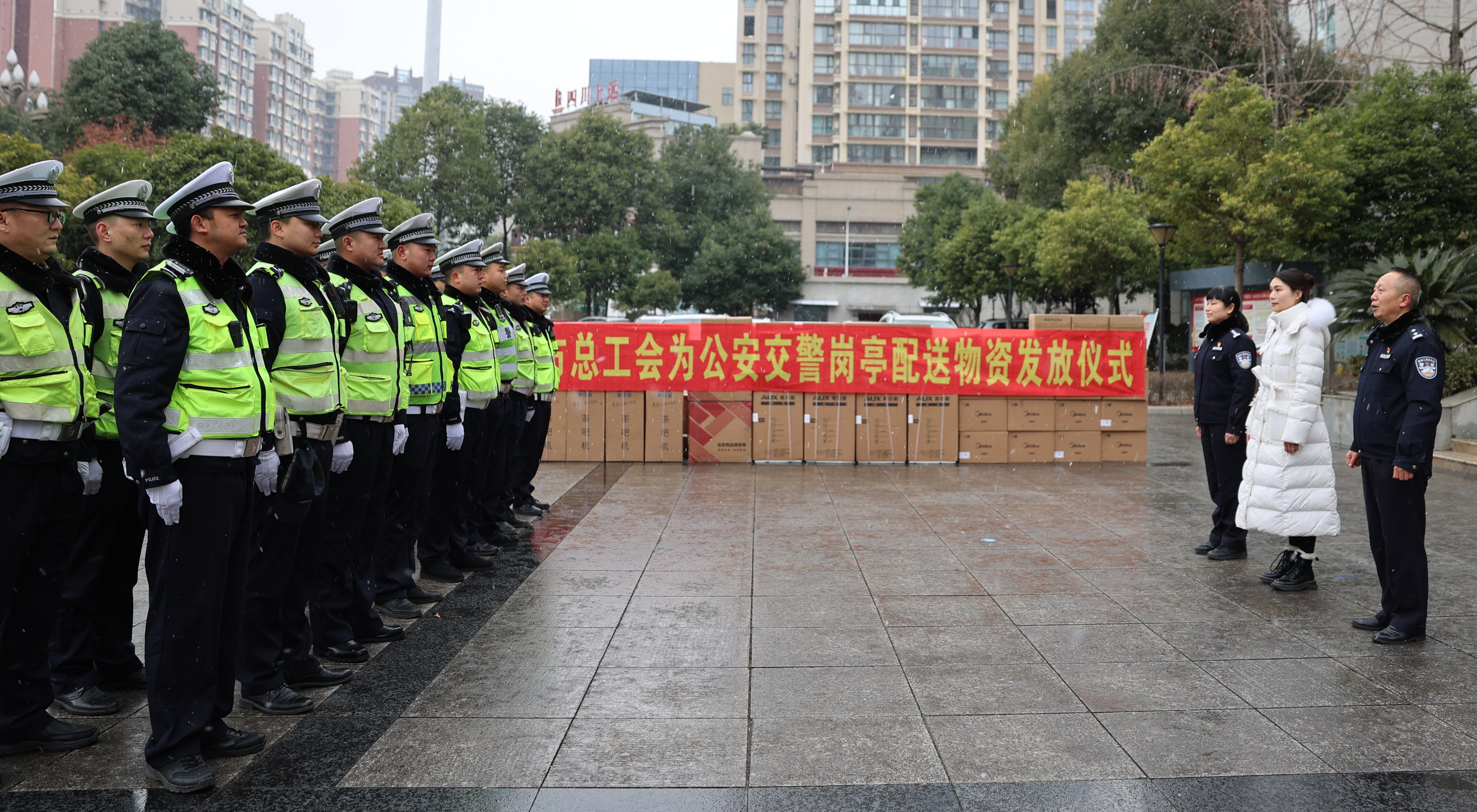 绵阳江油市总工会为江油市公安局交警大队配送物资 来源:51网 发布时间:2024-01-26 10:45:11 浏览次数: 次 【字体:小 大】 51网讯(吴松林 记者 吴健)1月23日上午,绵阳江油市总工会为江油市公安局交警大队举行了配送工会爱心物资仪式,市总工会党组成员、副主席蒋俊参加仪式并讲话。 发放仪式现场,恰逢大雪纷飞。蒋俊表示,交警是城市交通的守护者,不惧严寒与酷暑,都坚守在岗位上,保障市民安全出行。交警同志为市民保驾护航,江油市总工会为交警同志做好后勤服务。此次配送的物资包括冷藏柜、微波炉、医药箱、茶吧机和座椅等,价值约10万元。 编辑:pxj 分享到: 【打印正文】