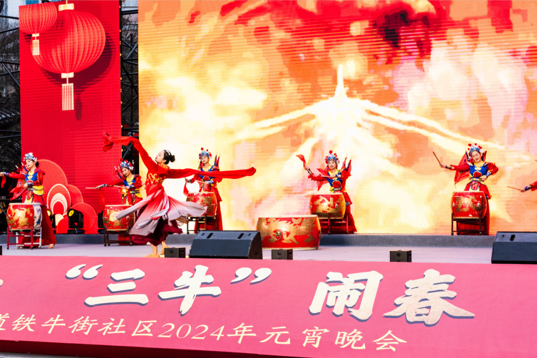 在铁牛广场,首届“龙腾盛世·‘三牛’闹春”元宵晚会文艺汇演举行。活动在气势磅礴的开场鼓《吉祥鼓上舞》中拉开序幕,歌舞表演、说唱快板、模仿秀等节目逐一呈现,文明实践知识有奖竞答将现场气氛烘托到高潮,小品《我要领衔》将“红色物业”融进艺术表演中,赢得现场职工群众赞誉和共鸣,为元宵佳节增添了浓厚的节日氛围。