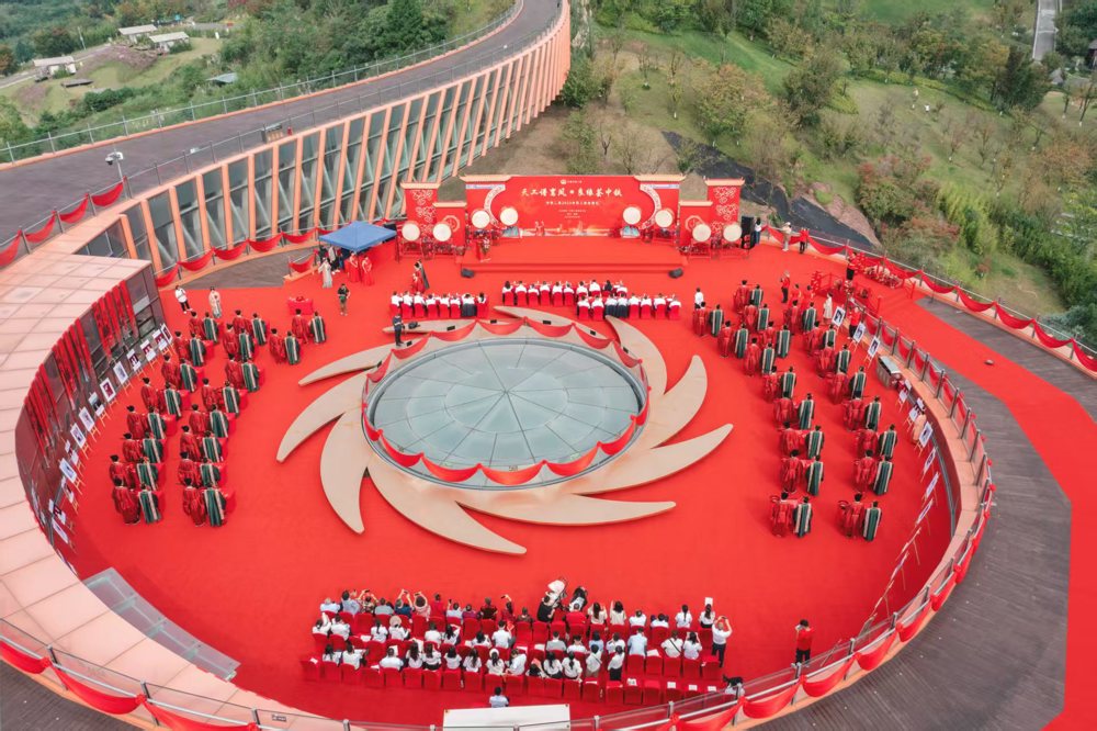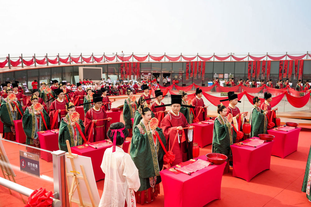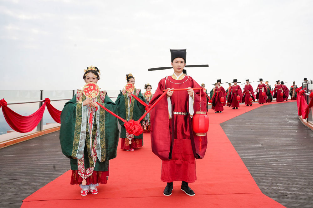 仪式现场,新人们身着典雅宋制婚服,在传统鼓乐与司仪吟诵中,跨过象征红红火火的火盆,走过寓意相连的鹊桥,完成庄重的“三拜”之礼。随后盥洗、合卺、结发、执手……一系列古韵十足的仪式,在巍峨的“城市之眼”映照下,将个人的幸福时刻升华为一场穿越千年的文化见证,为新人刻下了难忘的浪漫记忆。