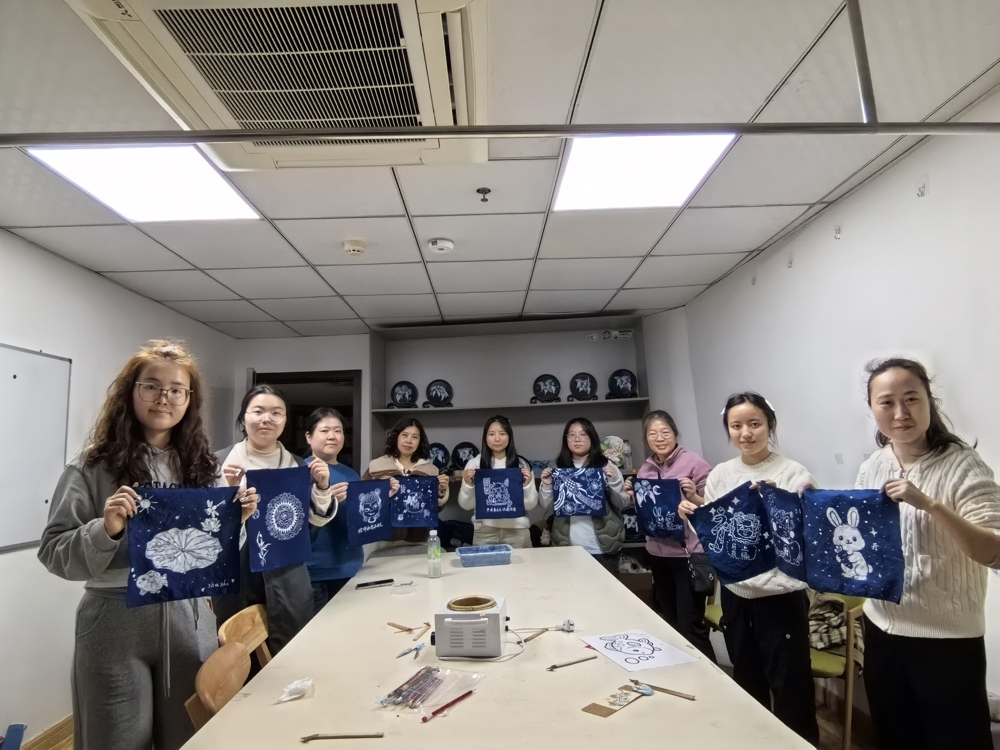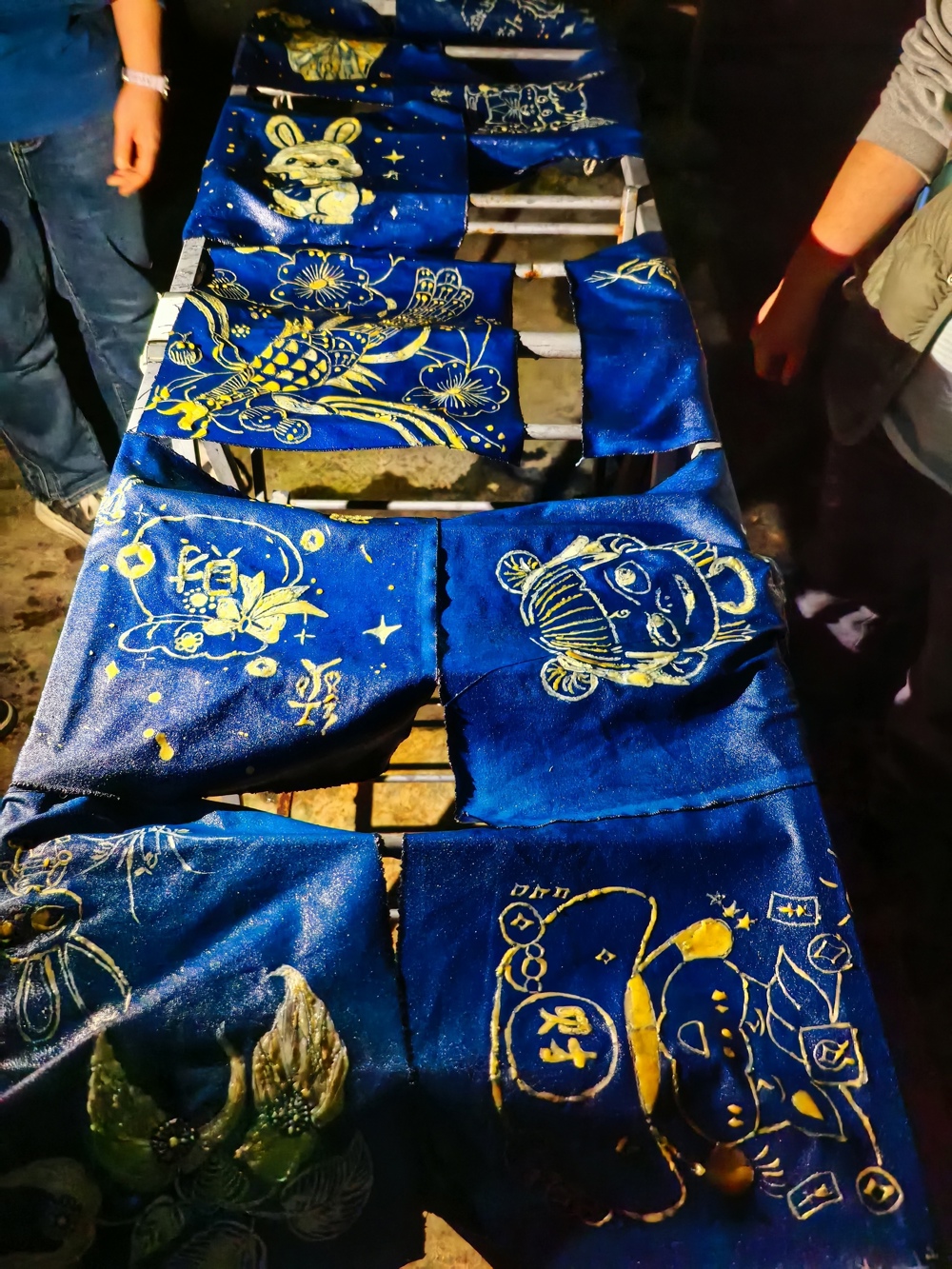3月12日的染色环节,将活动推向了高潮。学员们满怀期待地将绘制好的布料缓缓浸入蓝靛染缸,反复浸染,布料由浅入深,最终呈现深邃的靛蓝。当蜡层褪去,蓝底白花跃然眼前——活泼灵动的兔子、清秀典雅的珙桐、大气沉稳的荷塘……每一件都是世间独一无二的作品,凝聚着作者的巧思与专注。