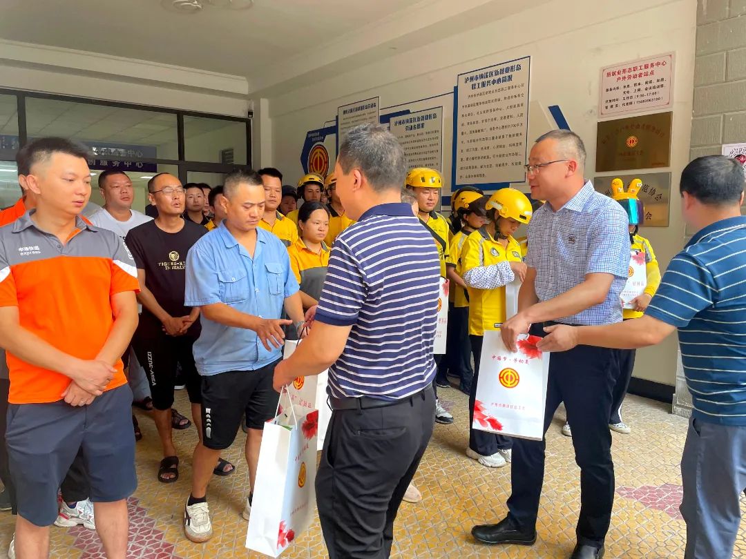 8月14日,纳溪区总工会负责人带队到纳溪区新就业形态职工服务中心开展“送清凉”慰问活动,为高温下坚守一线的劳动者送上工会“娘家人”的关怀,感谢劳动者在高温酷暑下坚守岗位、恪尽职守,叮嘱他们要合理安排作息、注意劳逸结合,做好防暑降温和交通安全工作。