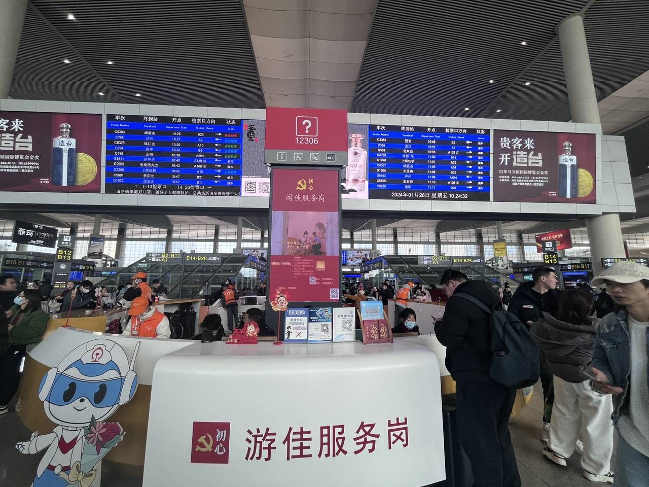 春运期间成都东站启用春运列车运行图,全站满图开行列车359.5列,并根据不同时段旅客出行需求动态灵活安排运力,通过加开夜间临客、动车组重联等方式保障旅客出行需求。为提升旅客出行体验,成都东站在卫生间增设60台热水设备,为旅客提供热水盥洗;更新检票闸机40台,在早晚及旅客集中进出站时段,增加安检通道12个,方便旅客快速通行;更新检票口显示屏27块,方便旅客快速查找检票口。并在候车室内张贴窗花、悬挂中国结,营造欢乐祥和的新年氛围。