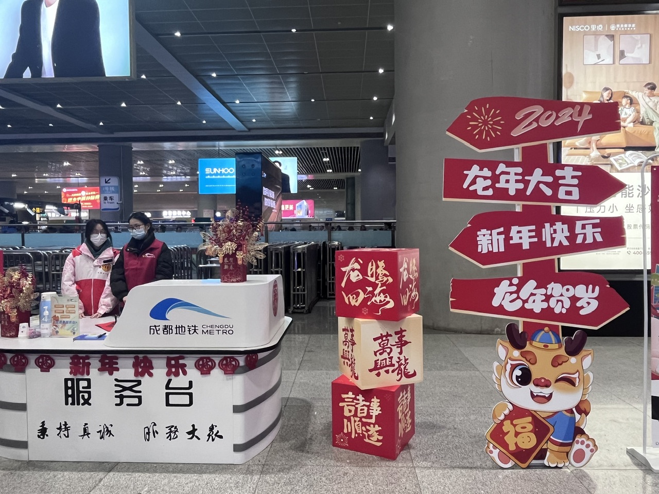 在地铁成都东客站,中国结、窗花、龙年玩偶等新春装饰焕然一新,用一抹抹靓丽红色,传递着温馨和谐的幸福年味。成都地铁运营公司相关负责人表示,为做好今年的春运服务,成都地铁从优化行车客运组织、强化设备运行监控、加强安全安保等方面,多措并举做好春运服务保障。