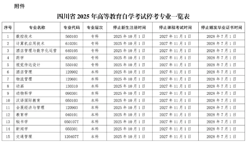 15个高等教育自学考试专业停考,四川省教育考试院发布公告