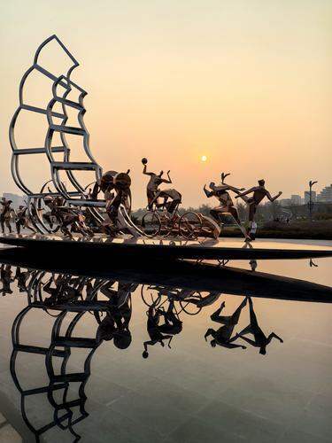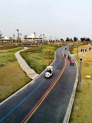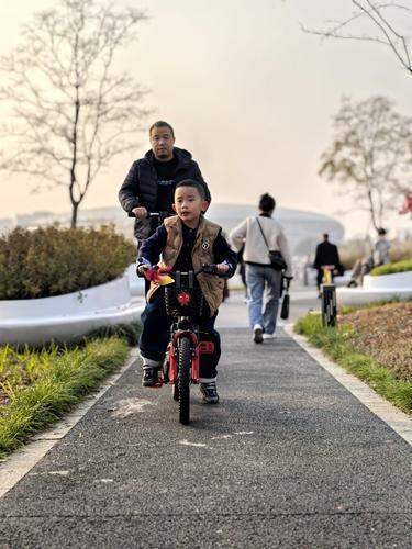 湖面波光粼粼,如同撒上了一层碎金。园内,平坦宽阔的环湖绿道上格外热闹。骑行爱好者们穿梭其间,成为一道流动的风景线。家长们则带着孩子悠闲地蹬着家庭观光车,欢声笑语洒满一路。