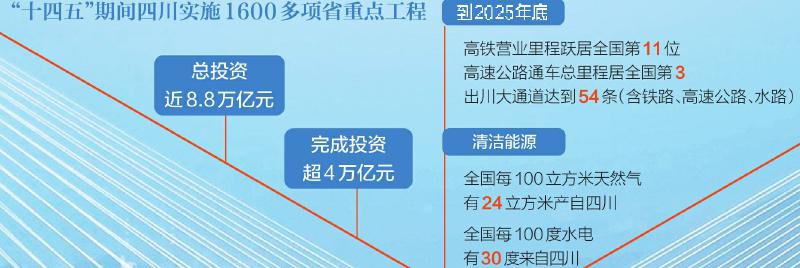 来自省发展改革委的数据显示,“十四五”期间,四川实施1600多项省重点工程,总投资近8.8万亿元,完成投资超4万亿元。以交通、能源、水利、通信网络及新基建为代表的重大工程,加快畅通战略大通道,重塑四川经济地理。进入“十五五”,超级工程还将拓开更多发展空间。