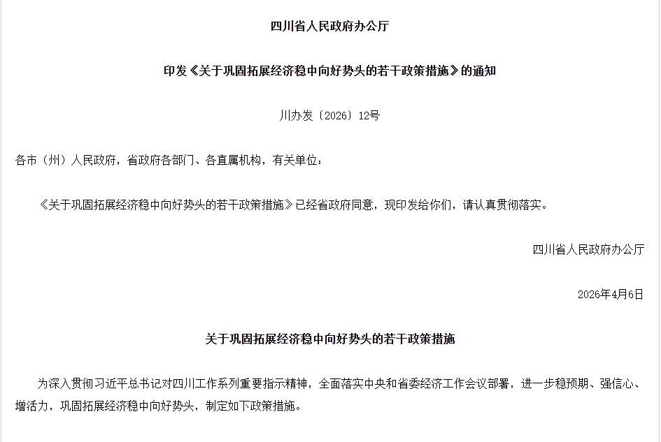 为深入贯彻习近平总书记对四川工作系列重要指示精神,全面落实中央和省委经济工作会议部署,进一步稳预期、强信心、增活力,省政府办公厅近日印发《关于巩固拓展经济稳中向好势头的若干政策措施》,该政策围绕大力支持消费提振、帮助企业降本减负、推进企业快速成长、促进产业转型升级等方面,推出一系列具有针对性的具体举措,旨在为经济持续回升向好注入强劲动力。