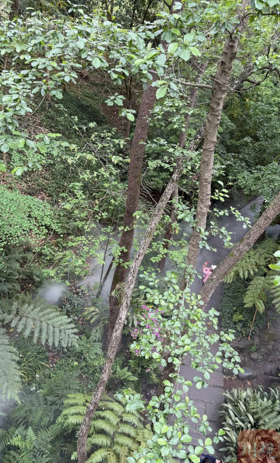 成都市植物园珍稀植物园,模拟沟谷雨林的喷雾系统常年运转,薄雾缭绕间,珙桐、桫椤、五小叶槭等国家一、二级保护植物错落生长。